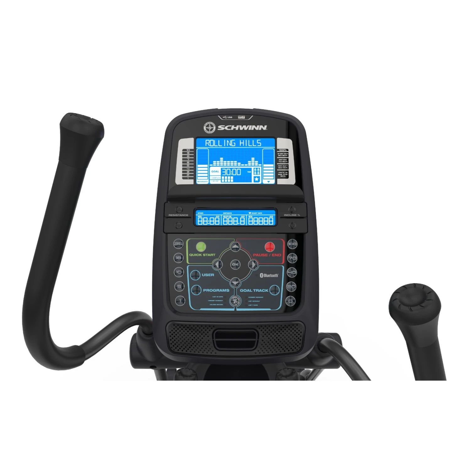 Los 29 programas de entrenamiento garantizan la suficiente variedad. Entre otros, tendrás 12 perfiles, 9 por control de pulso, 4 definidos por el usuario, 2 test de fitness, 1 test de recuperación y 1 de inicio rápido. Para la medición del pulso, la Bicicleta Elíptica Schwinn 570E cuenta con sensores de mano integrados. También se puede emplear una banda de pecho (de compra por separado).