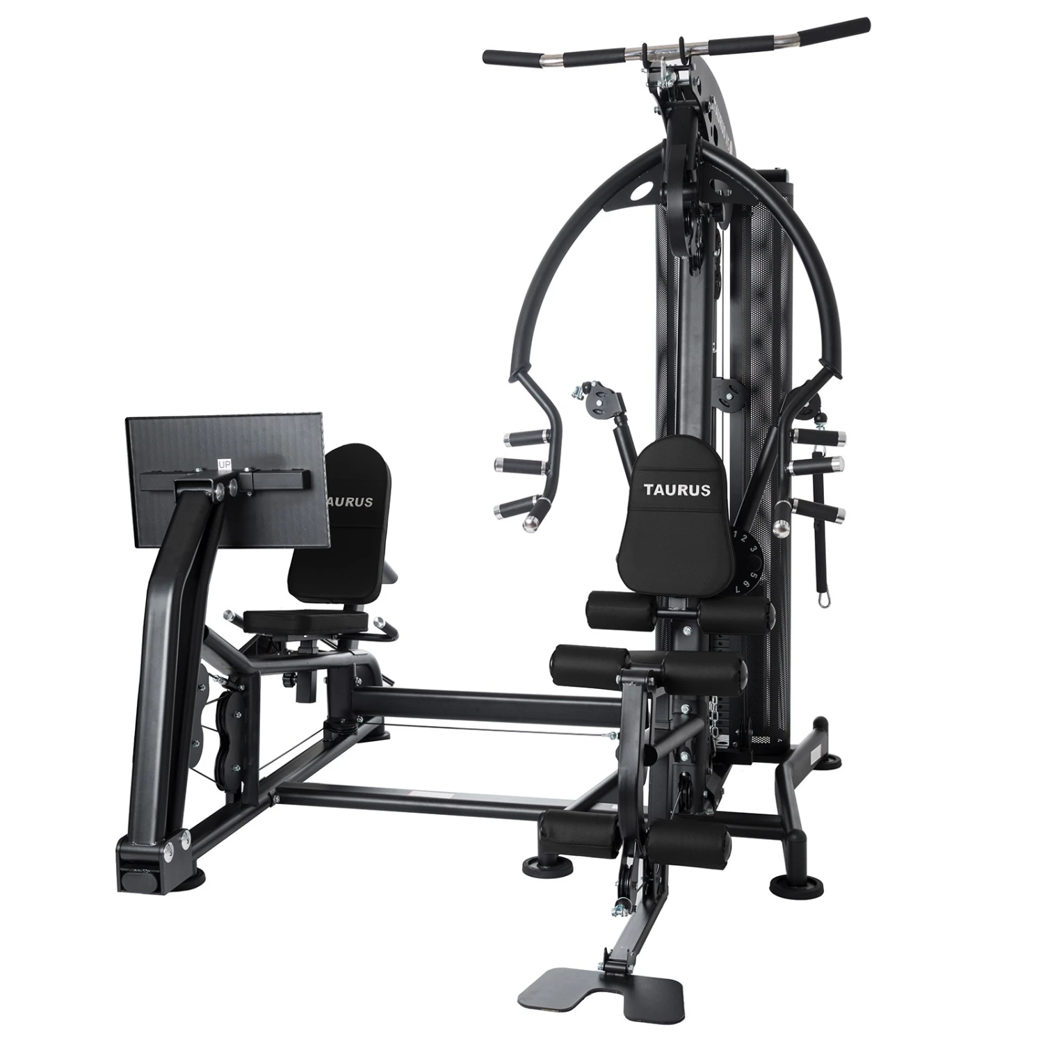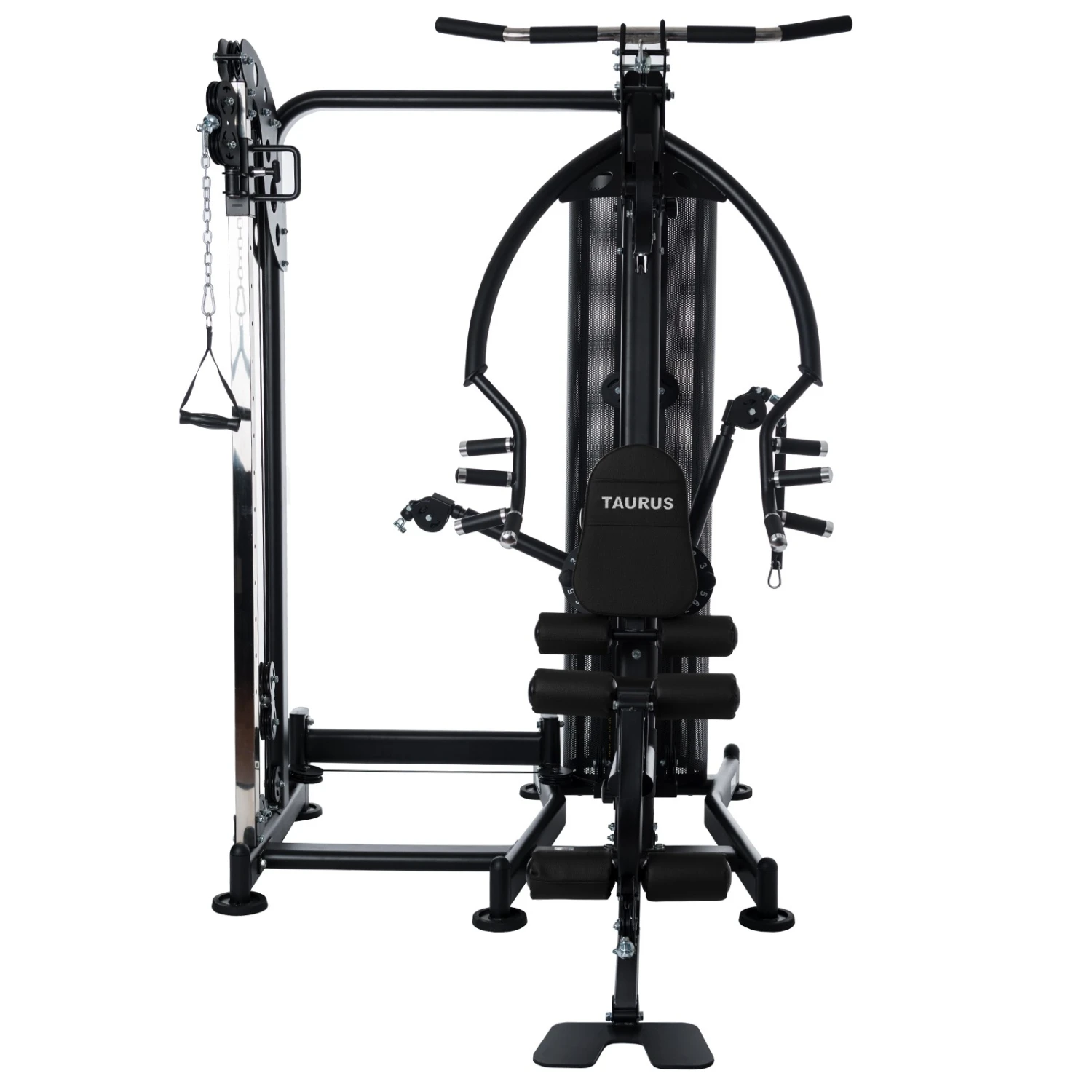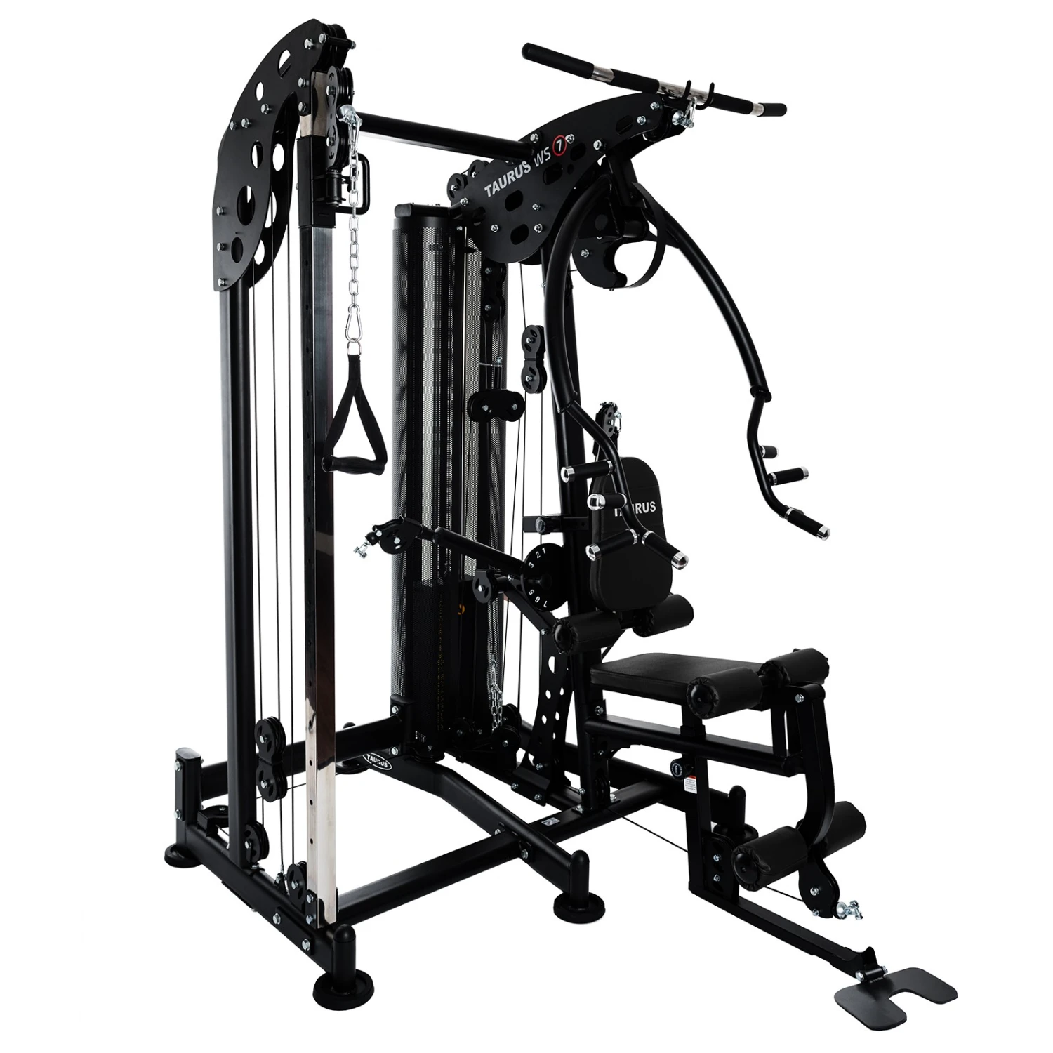 La Multiestación Taurus WS7 ofrece como tal incontables ejercicios para pectorales, brazos, hombros, abdominales, piernas y espalda. Prácticamente se pueden entrenar todos los grupos musculares en los diferentes elementos de la Multiestación Taurus WS7. En la estación de piernas podrás realizar extensiones y curl de piernas, y además hay diversos brazos con cables libres con multitud de ajustes posibles para realizar ejercicios específicos de distintas disciplinas deportivas. La sólida prensa permite realizar ejercicios de remo, para entrenar pectorales y hombros.