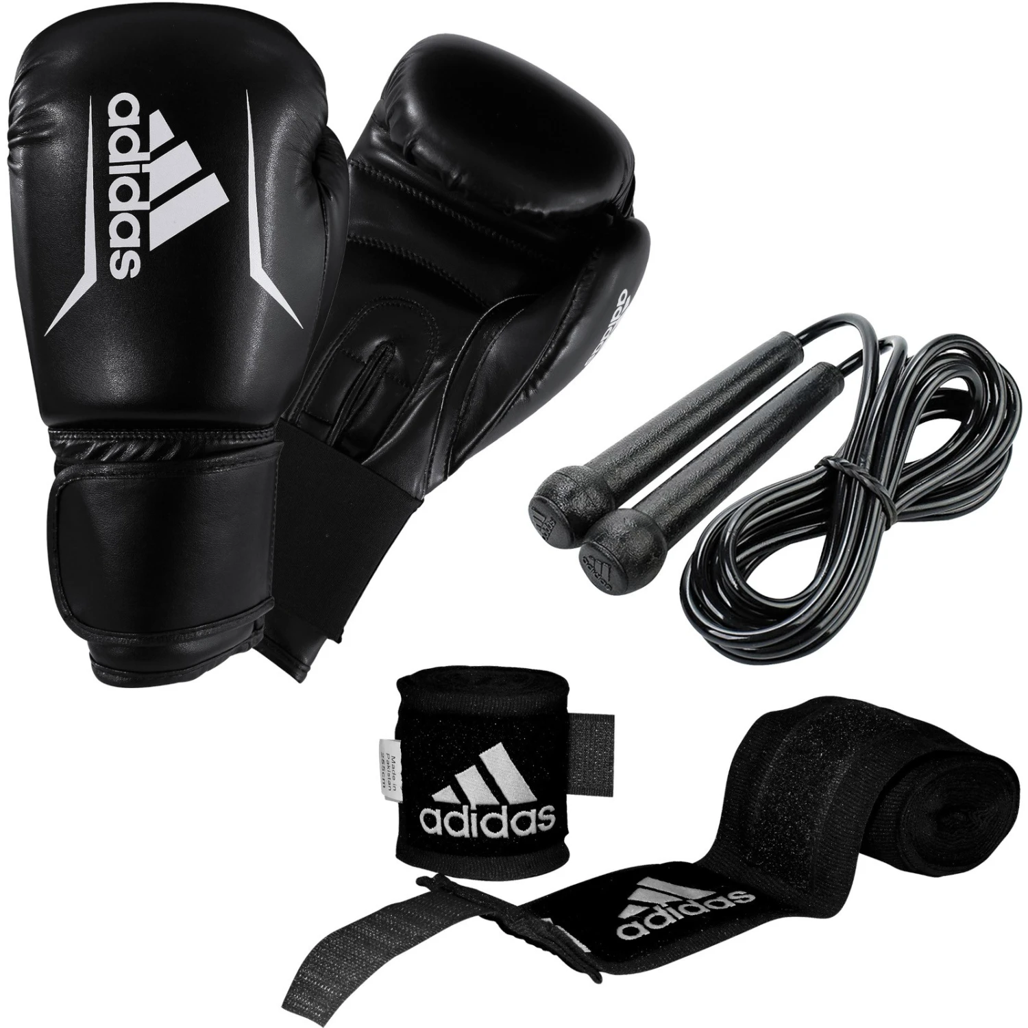 El Set de Boxeo adidas de tres piezas consta de una cuerda de saltar, vendas y guantes de boxeo. Saltar representa un clásico del boxeo y se utiliza principalmente para ejercicios de calentamiento antes de entrenar. Las vendas de 2,55 m de largo agarran y protegen las muñecas y las manos debajo de los guantes. Los guantes de 12 onzas están fabricados con cuero sintético duradero.